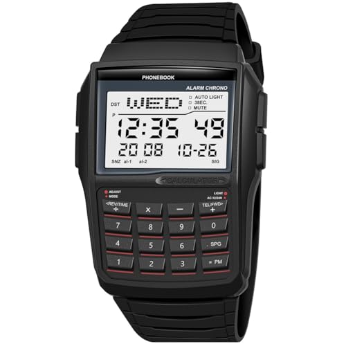 Características: Material de la carcasa: resina, acero inoxidable, movimiento de cuarzo, cristal de resina, luz LED, interruptor de luz automático, base de datos de retroiluminación, calculadora de doble hora de 8 dígitos, cronómetro de 1/100 segundos, 5 alarmas multifunción (con 1 alarma de repetición), señal horaria por hora, calendario automático completo (hasta el año 2099), funcionamiento con botones, encendido/apagado, precisión de cronometraje regular: ± 3000 Segundos al mes. Cierre desplegable ajustable, tamaño aproximado de la caja: 46,5 x 33,1 x 8,7 mm